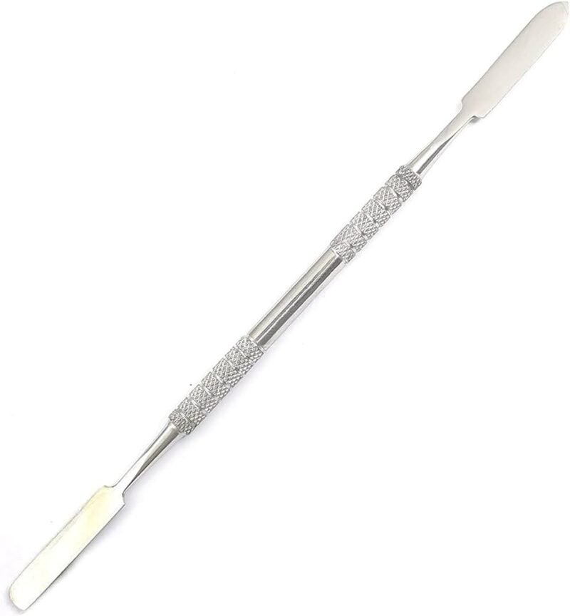 A double-ended cement spatula features dual, flexible ends for dental cement mixing. The plastic instrument, designed for contouring and placing composite materials, resists sticking and provides precision in dental restorations.
