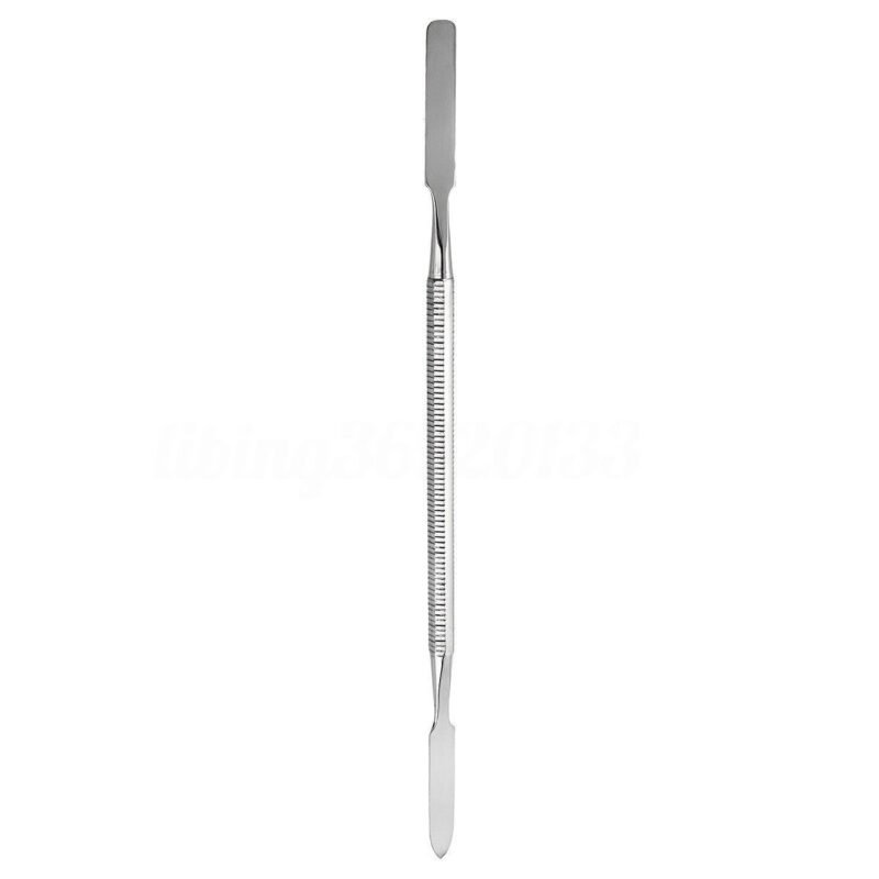 A double-ended cement spatula is a dental tool with flat, flexible blades on both ends, used for mixing and applying dental cements in restorative procedures.