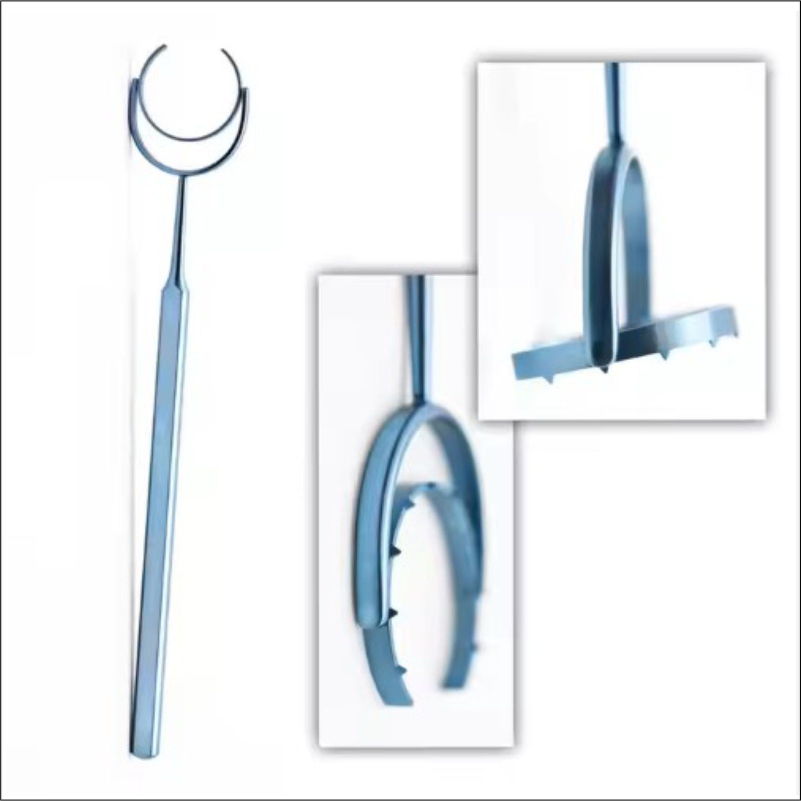 🔹 Semi-Circular Fixation Ring – Features serrated edges for a stable grip while allowing partial eye exposure.