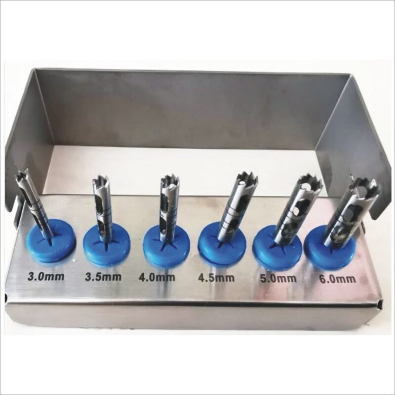 The kit includes six different trephine drill sizes, specifically tailored to meet a variety of surgical needs and anatomical considerations. This versatility empowers surgeons to choose the ideal drill for each procedure, ensuring optimal results and procedural effectiveness.